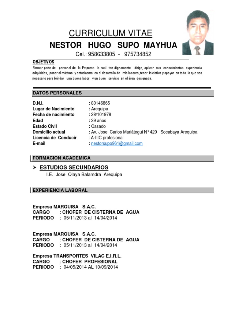 Ejemplo De Curriculum Vitae Para Conductores Y Choferes
